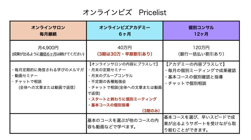 オンラインビズ 基本のPricelist